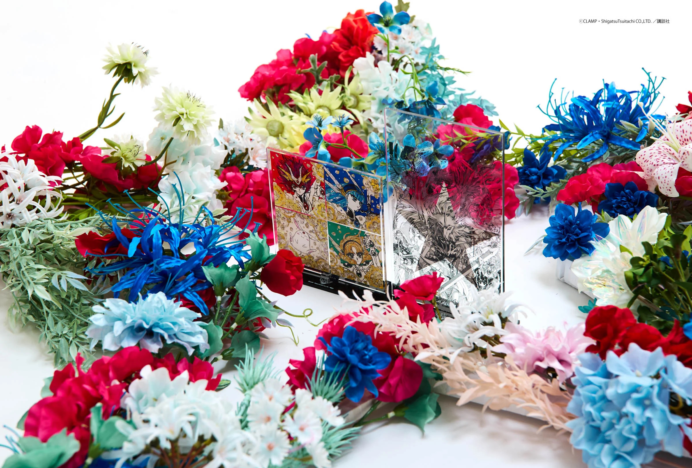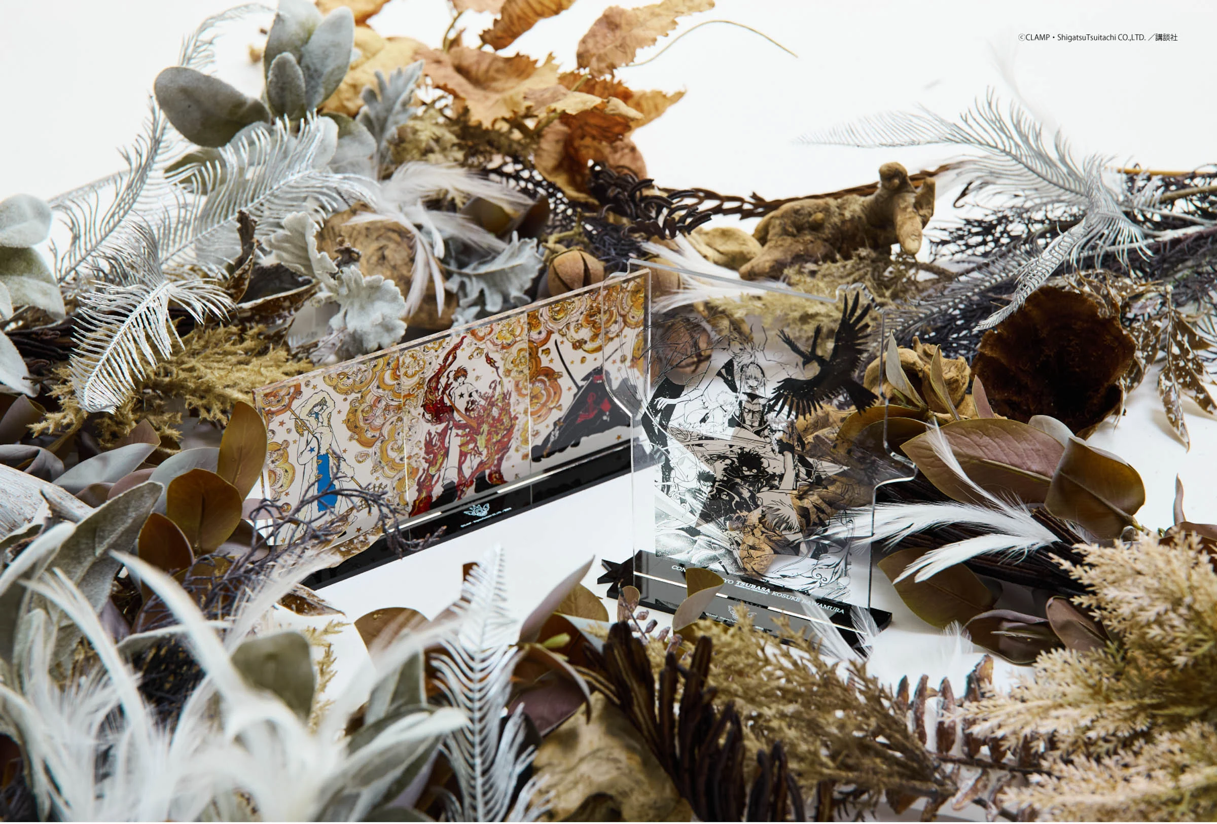 The collection features a mix of apparel and accessories, including graphic tees, jackets, and acrylic stands, each adorned with iconic motifs like feathers, magical sigils, and character silhouettes. The designs channel the emotional resonance and visual dynamism of CLAMP’s storytelling, offering fans a wearable tribute to their favorite universes.
